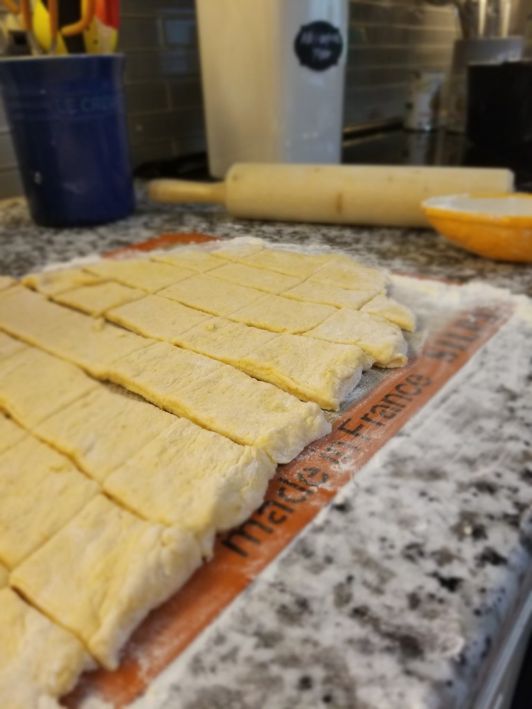 Place your dough, which will be very wet, onto a floured surface. I use a Silpat silicone mat because it stays in place, and it’s French. I feel fancier when I use French…anything. My big Dutch oven is Le Creuset…also French? Oui, c’est! Anyway, add a little more flour so it doesn’t stick to your hands. Then, roll it out until it’s somewhat thin. Let it sit for about five minutes before cutting it. Now, if your chicken is still boiling, fine. If it’s cooked, take it out of the pot and put it on a cutting board to cool…cool enough to be able to tear it apart. Now, cut your dumplings into long squares. In kindergarten, we learned these were called rectangles. I like to use a pizza cutter because my dumplings look more artistic (as in, they’re not at all straight). A knife is better for perfection. I’ve used both. Let them sit until the chicken is ready to go back in. Meanwhile, add the mushroom soup, chicken stock, and more water if a lot of it boiled out. ***If you’re using roasted chicken, shred it, and add it now.*** Stir it all together and let it low simmer for just a minute or two.